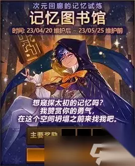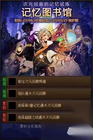 第三劳动节新副本次元回廊的配套活动,这个副本被整整脱了一个多月,原本3月就该上线,硬生生拖到了五一劳动节版本,策划诚意劝退玩家。配套活动是记忆图书馆,因为这个是魔法师主题副本。基本上就是送团本贴膜的材料,加速玩家毕业的。