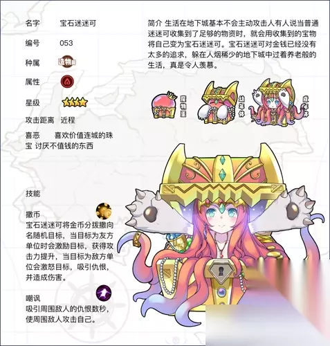 基本信息 名字宝石迷迷可编号NO.54星级4种族宝箱怪属性火攻击距离近类型物灵魔物简介非常有钱的迷迷可,因为太有钱所以几乎不会攻击人,甚至有人认为她们和迷迷可不是同一种生物。 获取途径品库金币抽蛋(南赛拉姆)、品库氪金抽蛋强化经验261派遣可获得金币3479孵化时间02:32:00喜爱厌恶备注控制、辅助、AOE 基础属性 生命528(98~126)攻击44(9.1~11.7)防御48(8.6~11.3)敏捷16(3.7~5.1) 潜能突破 潜能1生命150攻击4防御14敏捷1潜能2生命480攻击16防御40敏捷5 羁绊 羁绊材料木板*10一阶段治愈之心 每5秒恢复25生命许容之心 受伤时4%概率眩晕敌人祝福之心 所有魔物生命+16 技能 技能名消耗CD效果撒币1510s宝石迷迷可将金币分2拨撒向3名随机目标,当目标为友方单位时会激励目标,获得20%攻击力提升2秒,当目标为敌方单位会激怒目标,吸引仇恨2秒,并造成80%伤害。嘲讽1317s吸引周围敌人的仇恨3秒,使敌人攻击自己。 宝石迷迷可到底怎么样呢?技能属性图鉴全在这了,拿着收藏吧,这么可爱的魔物。想要了解更多内容可以关注我们本网站。 我们总会在游戏中遇到各种各样的小魔物,有的强大,有的可爱,有的甚至有点废柴,但正是这些多样性让游戏世界变得有趣。 宝石迷迷可虽然强度一般,但它的技能设计还是挺有意思的,尤其是撒币技能,既能辅助队友又能打击敌人,用好了还是挺实用的。当然,培养不培养就看个人喜好了。 游戏嘛,最重要的是开心,管它强度如何,能玩得开心就好。我们下次再见。