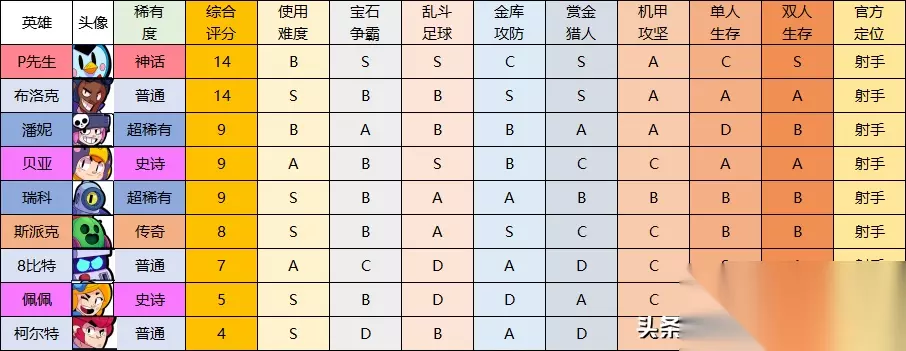 1、P先生 职业赛常客,当前版本比较公认的第一射手,能与其媲美的布洛克因近期挨到削弱了血量加上操作难度比较大,强度上稍弱于P先生,无论是伤害还是干扰都是一等一的强,多种模式下表现的都很出色,操作容易上手,可玩性很高 普攻射程比较远,特点是打到人或墙以后弹起再次砸向后方,能够多造成一些伤害,普攻可以直线打人也可以跃墙打人,射手和投手的两种优势他都具备 大招会放出一个基地,不断放出机械企鹅骚扰敌人,伤害一般,但是令对面烦不胜烦 两种星徽首推小心轻敌,无论是吃鸡还是团战都很给力。企鹅唯一缺点就是腿短,怕近身,一旦被近身由于没有有效的逃跑手段,很难逃脱。所以,玩企鹅就需要控制好与敌人的距离和走位,学会耍阴。无论是躲草丛隔墙放暗箭还是草丛放机器人都让对手防不胜防,大招可以配合普攻打输出,也可以放草丛阴人,逃跑的时候也可以用来提前封路。