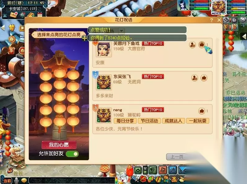 三、花灯祈心愿(花灯许愿) 参与条件: 等级≥30,单人 玩法说明: 1、活动期间,可以前往花灯使者(长安城 225,121)或长安城内灯笼架,点击进入花灯界面可进行许愿或查看其它玩家祝福语;