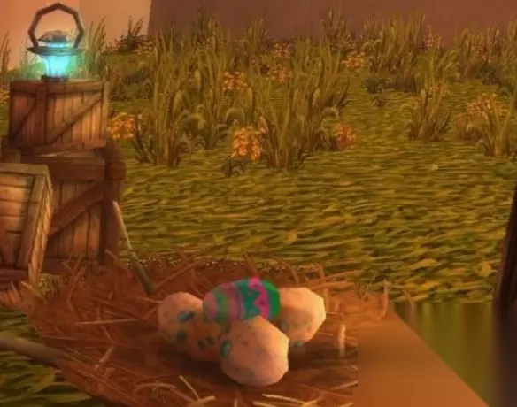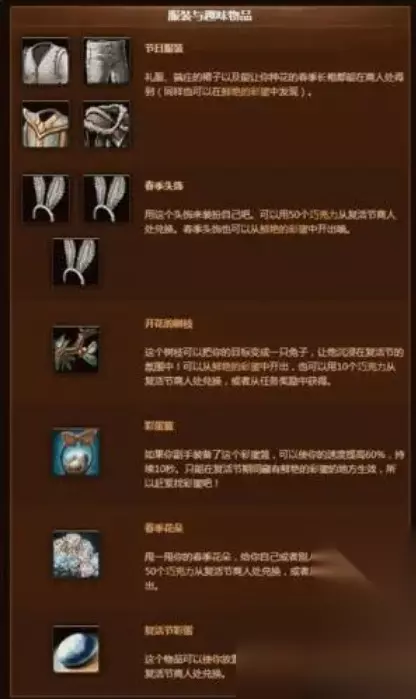[复活节巧克力]:94% [鲜艳的蛋壳碎片]:任务物品 [开花的树枝]:1% [黑色礼服短裤]:0.7% [白色礼服衬衣]:0.7% [端庄的裙子]:0.5% [春季头饰]:0.5% [春季花朵]:0.5% [春季兔脚]:0.5% [厄运兔脚]:0.5% [春季长袍]:0.5% [迅捷春日陆行鸟]:0.01%