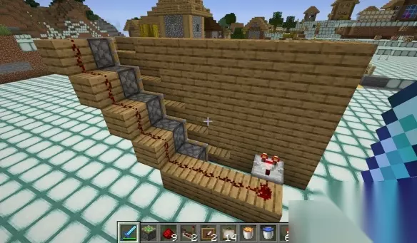 4、最后在物品展示框背部放上红石比较器、在活塞的背部放上木板,并用红石连接线路就可以了。