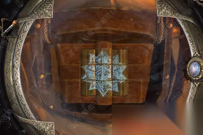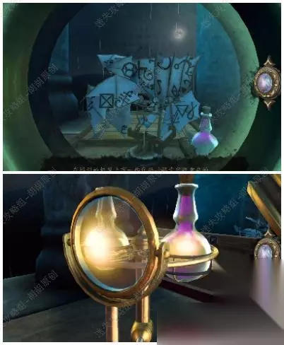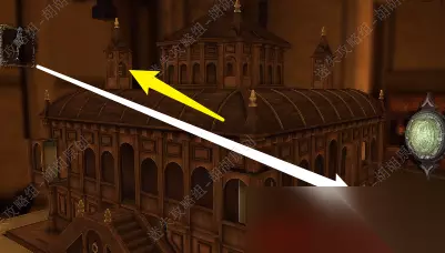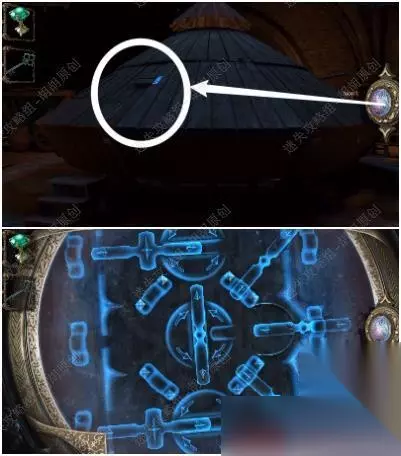 4.看向大门,戴上透视镜。可以看出是一个滑动轮,将缺口都转至下图的中心,完成后大门打开,门外的高塔炸裂,大鸟飞落图书馆.... 4