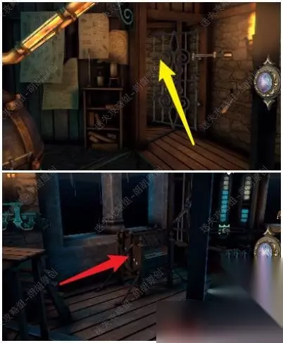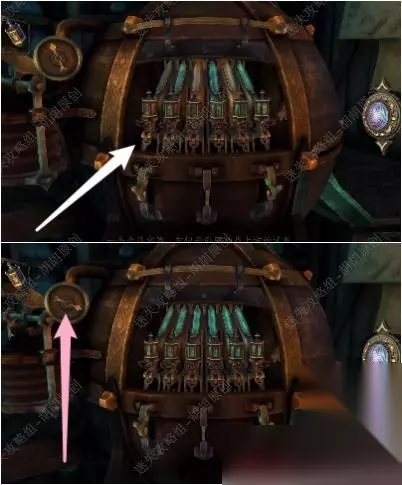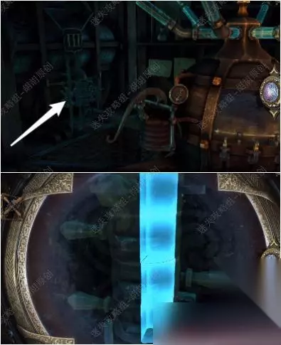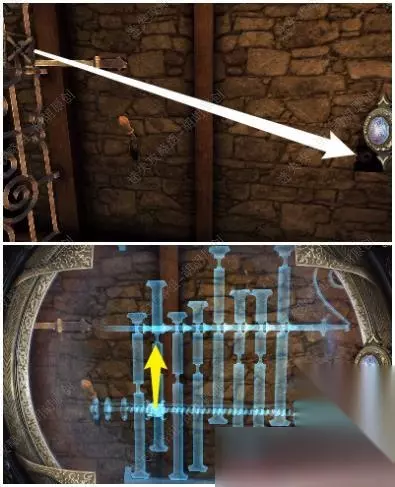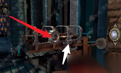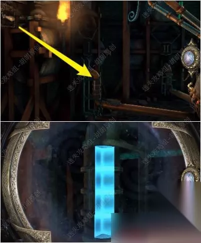 121.铁门前的白箭头处放上木轮子,戴上透视镜,通过左边的手柄和右边的木轮,控制中间的滑块最后将蓝管调整至下图,铁门打开 121.1.2