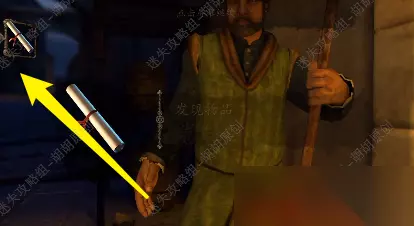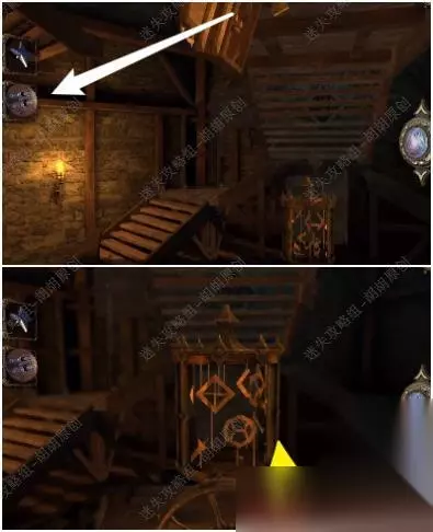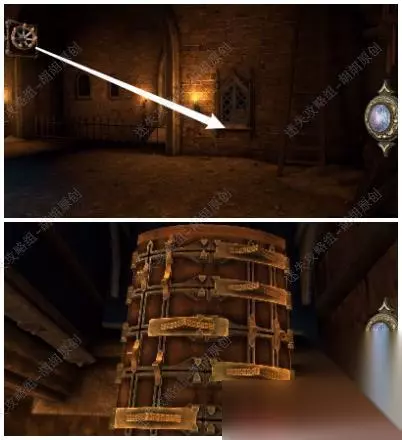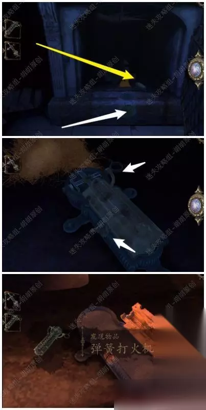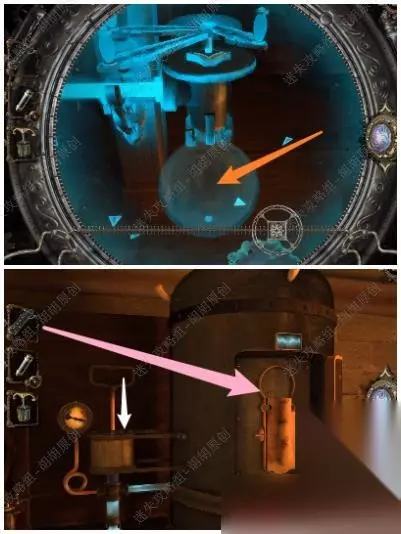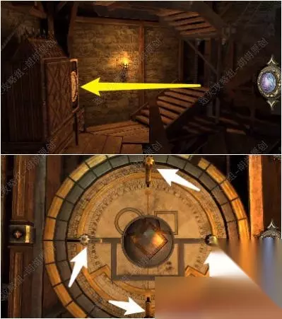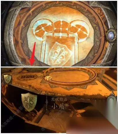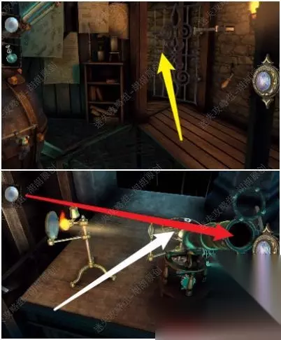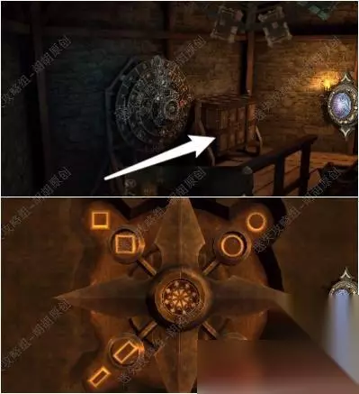 82.白箭头处转动金属盘打开黄箭头处的木板,戴上透视镜,将盾送至对应的图案位置上去,完成后获得带环金属筒 82.1.2