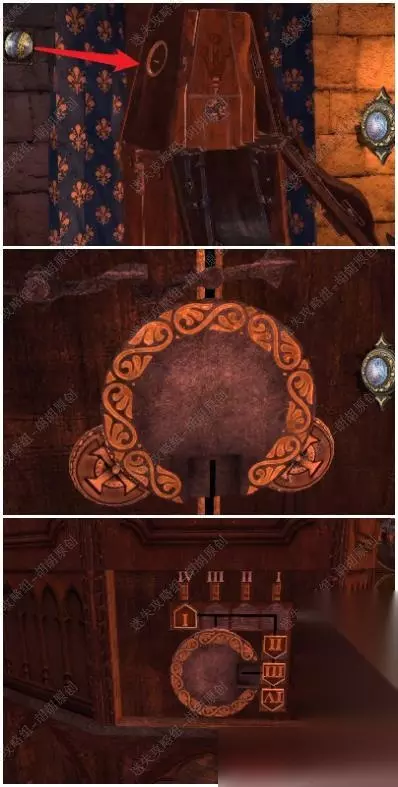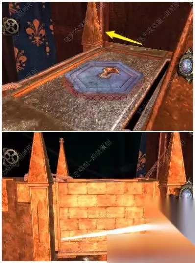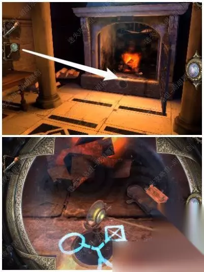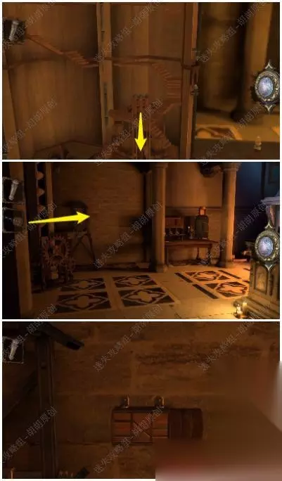 95.黄箭头处按下,底下小木盒打开获得奇怪的锁装置和一封信;黄箭头处放奇怪的锁装置,将木块旋转至下图图案,机关启动,接下来,进入第六关 95.1.2.3