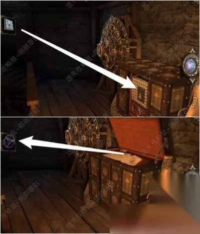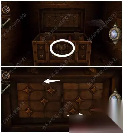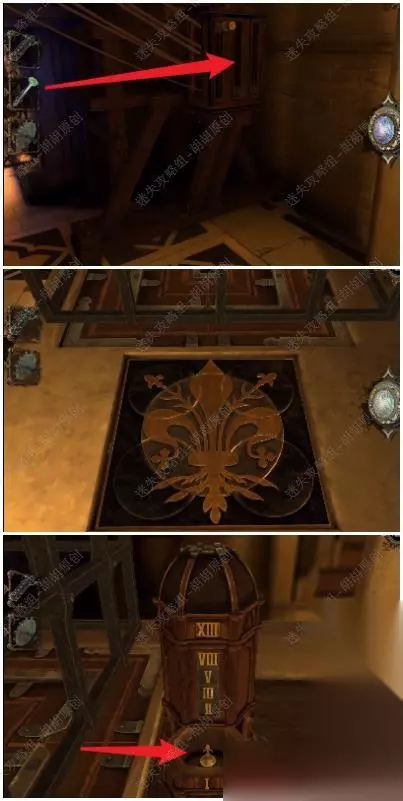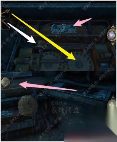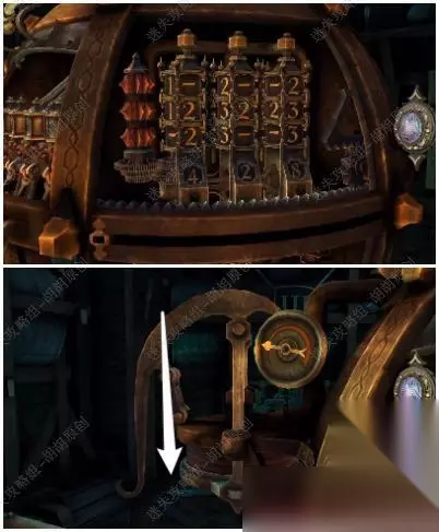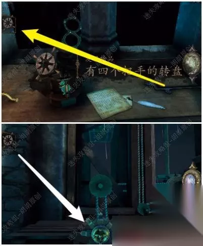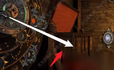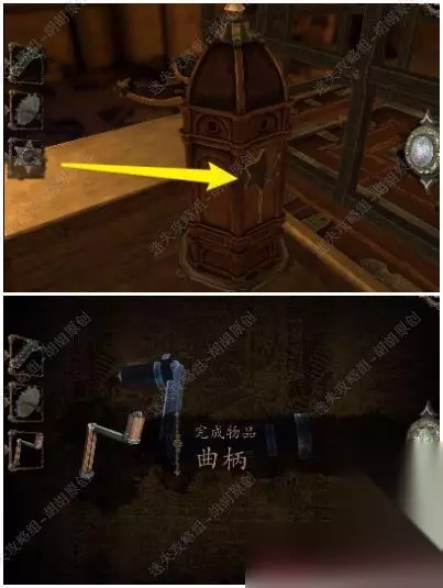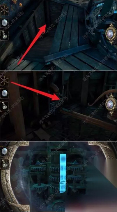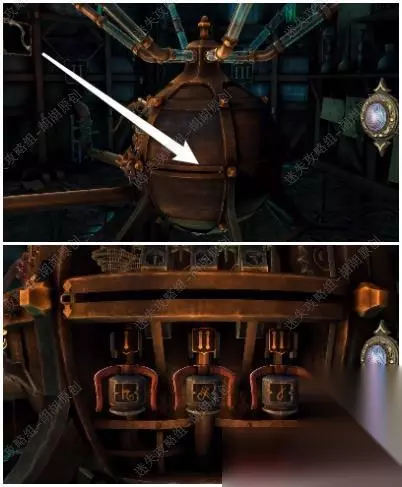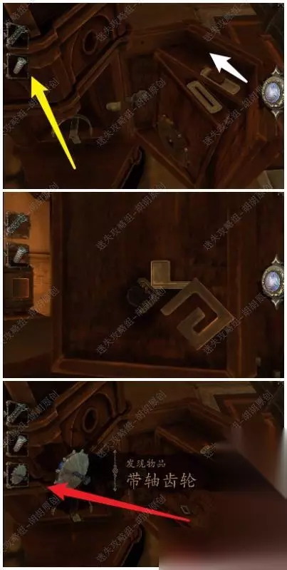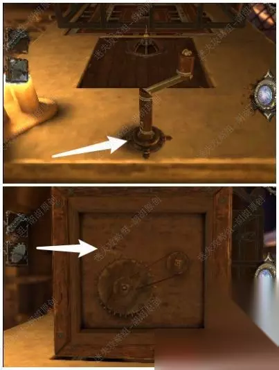 105.白箭头处放上齿轮,转动,出来一个箱子,按照下图将箱子打开拿到金属曲柄; 105.1.2