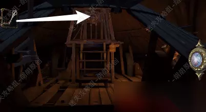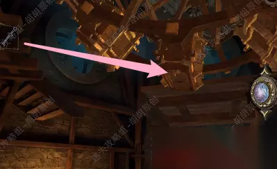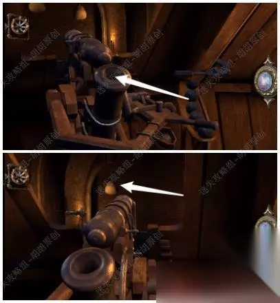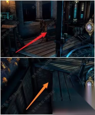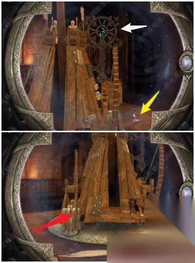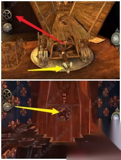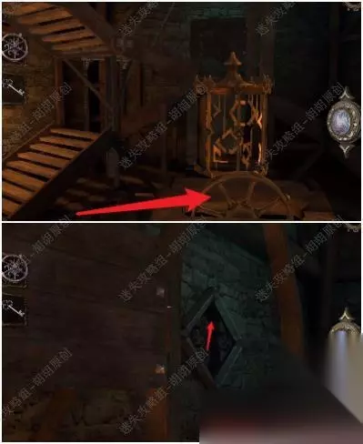 47.旋转木块找到下图处,白框使用刀子将绳子割断;打开木板,放上大齿轮,齿轮运转;黄箭头处拿到银鸽曲柄,黄箭头放上曲柄转动;白框处拿到六角块 47.1.2