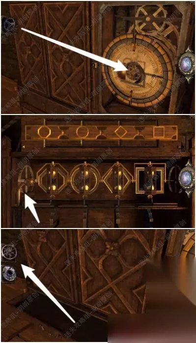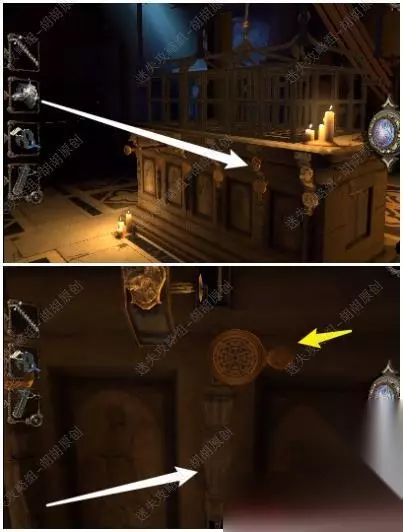 116.黄箭头处放入十字形头钥匙,按照下图先将滑块摆放至一条线,白箭头处下拉,滑块转至对应位置,白箭头处拿到四角银奖章 116.1.2