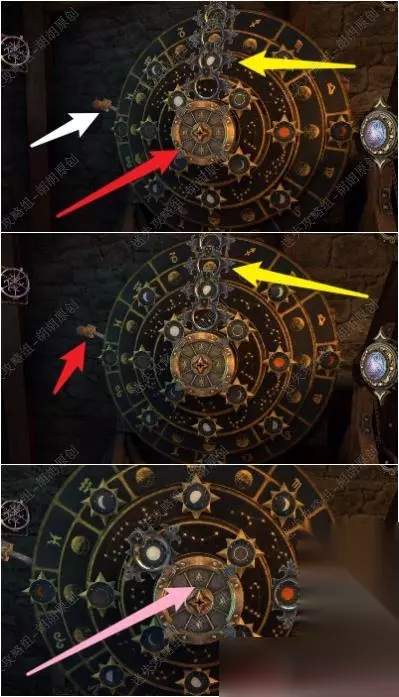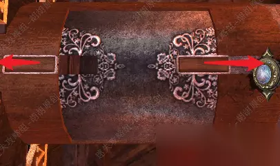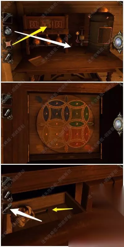 110.白箭头处放入齿轮,机关启动,左侧箱子移动打开,将滑块滑动到对应图案处,白箭头处转轮运作后最终,底下的抽屉打开,拿到带齿轮的金色拨号盘 110.3