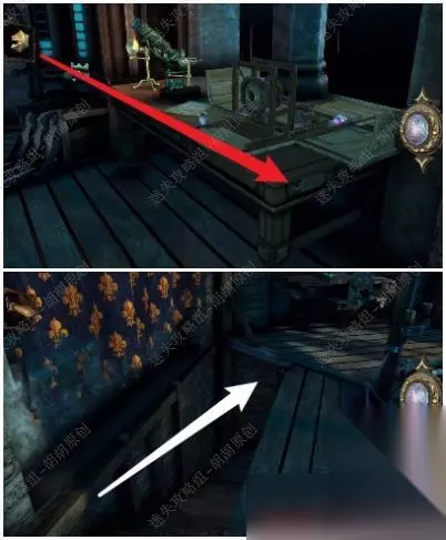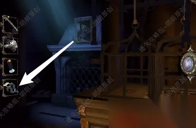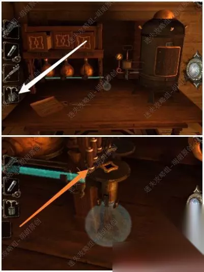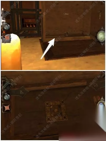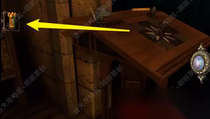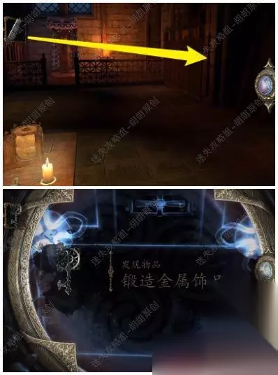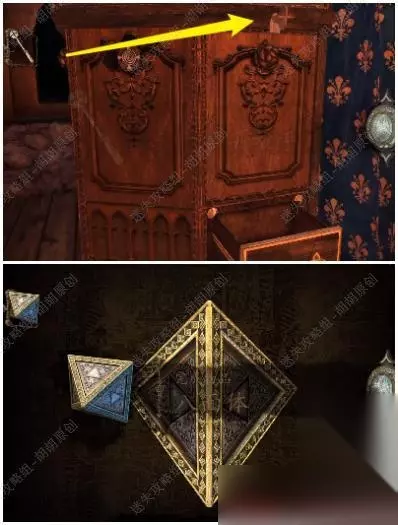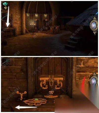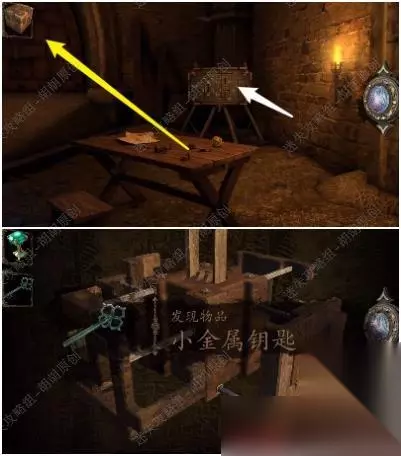 第六关 96.桌子上黄箭头处获得立方体,白箭头处进入小游戏6-1,完成后获得镶嵌绿宝石的黄金配件;立方体打开获得小金属钥匙 96.1.2