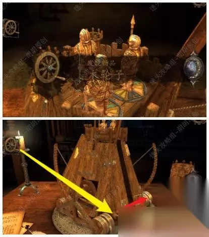 第三关 18.来到中间桌子上,将士兵旋转至下图位置,拿到木轮子;接着旗子飘动轮子升起,黄箭头处放上木轮子转动,出来一个抛物的小装置,先不管,红箭头处拿到小金属零件,接着烟花安排上 18.1.2