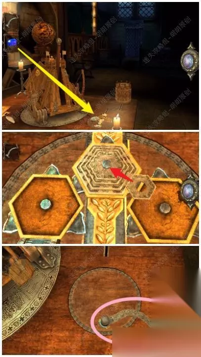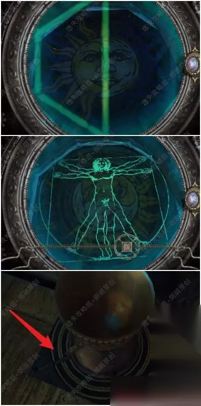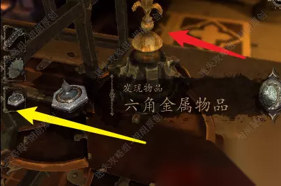 77.顶上红箭头处放入达芬奇模型的一部分,黄箭头处拿到六角金属物品,六角金属点击打开最后拿到星形奖章 77.1