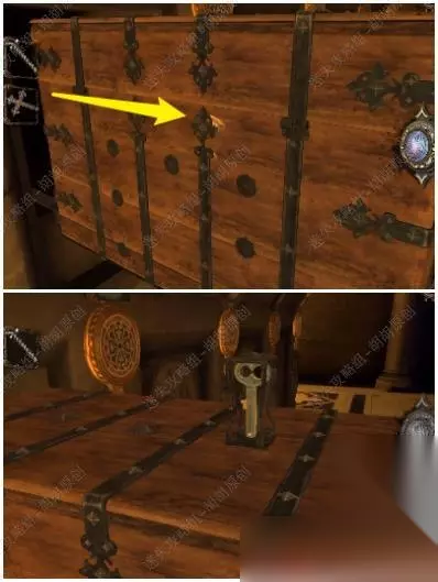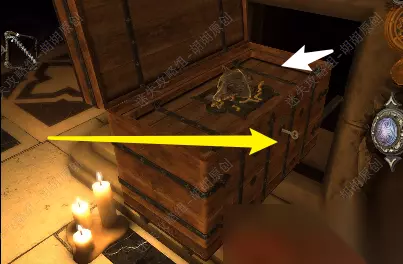 64.展开的钥匙插入黄箭头处,木箱子打开获得金属狼头; 64.1