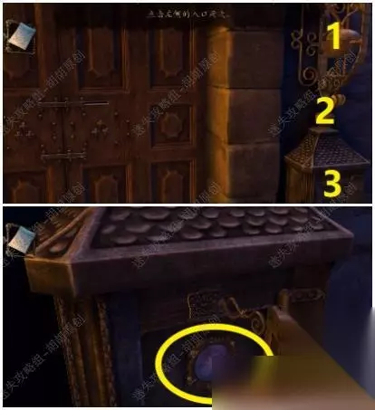 3.左侧看到一扇大门,这就是图书馆,右边有一座小塔,1处按照教程旋转一下拿到钥匙的一部分;2处旋转拿到钥匙的另一部分;两个钥匙的部分组合成一个钥匙,对塔的底部3处使用钥匙并转动,拿到里面的透视镜 3.2.3