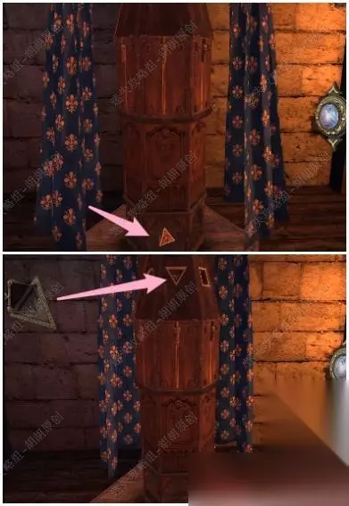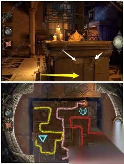 52.进入后去前方的石柱,戴上透视镜,按照下图将图形调整好方向,接着按照红箭头处旋转好位置,杯子掉落石柱裂开 52.1.2.3