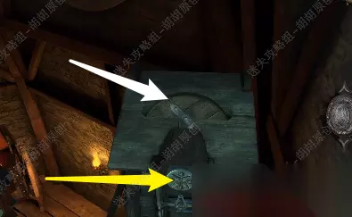 94.塔的上方慢慢上升一座新的小塔,白箭头处转动转轮,黄箭头处可以拿到木把手 94.1
