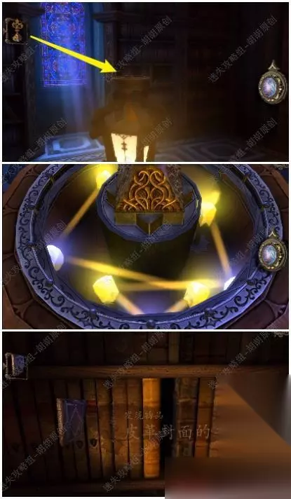 15.灯柱的上方放入印章,按照下图调整发光石的位置,完成后一束光打在书架上,去书架拿到一本皮革封面的书 15.1.2.3