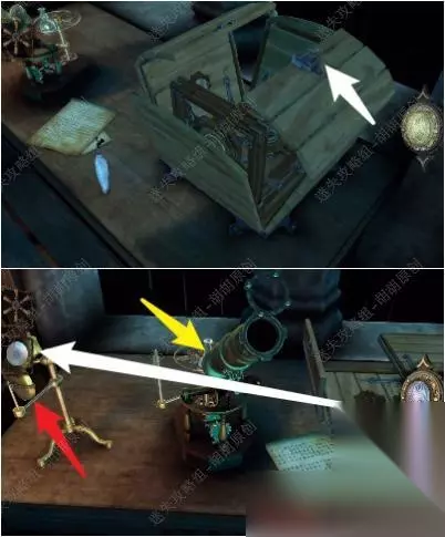 124.桌上放上木盒,白箭头处拉开打开箱子,箱子里拿到小镜片,黄箭头处拿到空测试瓶,红箭头处将光束打在黄箭头处的镜片上 124.1.2