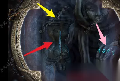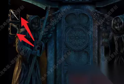 8.接着往左可以看到一个雕塑,黄箭头处放卷轴标志,转动,前方有点点小高能,然后头部打开进入一个小游戏 8