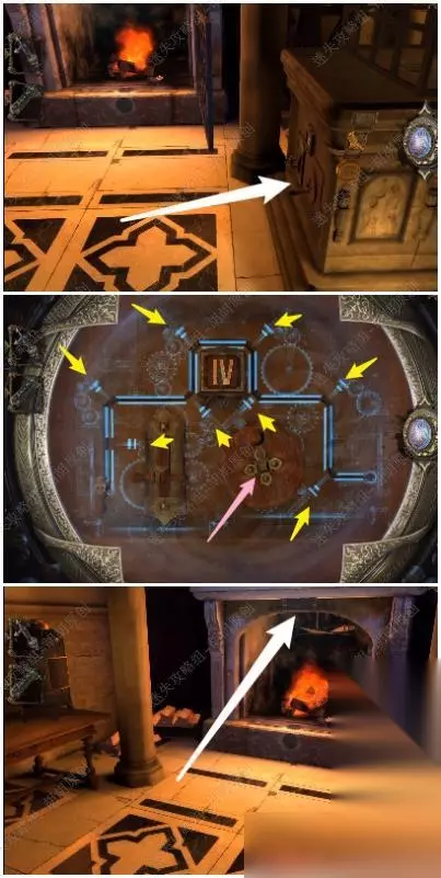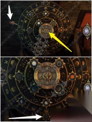 113.白箭头处拿到设备的一部分,与物品栏里的齿轮组合获得刻度盘齿轮传动装置;白箭头处放入装置,黄箭头处转动球面直至完整将有图形的球面露出来,白箭头处开始发光,旋转直至装置不再发光 113.1