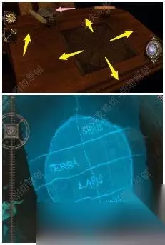 22. 给大金属球安上太阳形状的钥匙,大金属球变成大地球仪,转动球体的部分,按照下图的提示,戴上透视镜输入对应位置对应的英文字母,最后成为一个完好的地球仪 22.1