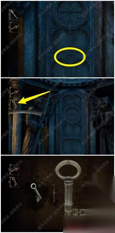 20.红箭头处点开转至与T字孔重合,黄箭头处拿到一把奇怪的钥匙,奇怪的钥匙按照下图完成获得调整好的钥匙 20.1.2
