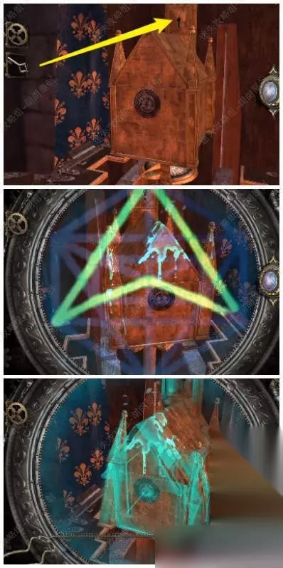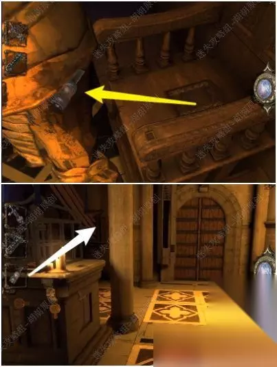 127.黄箭头进入铁门内,上楼,白箭头处放入装满的测试瓶,红箭头处放入镜片,转动镜片,底下拿到大奖章 127.1.2