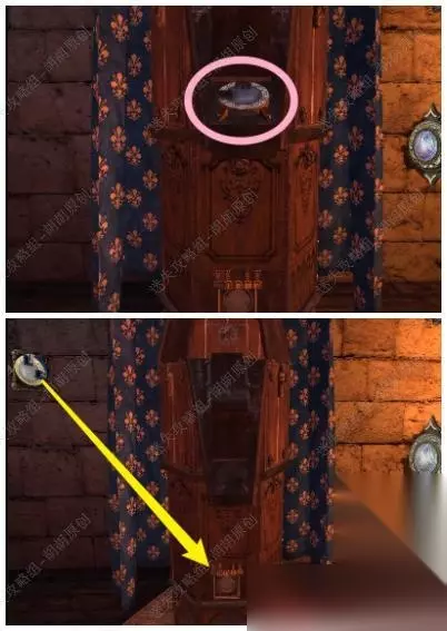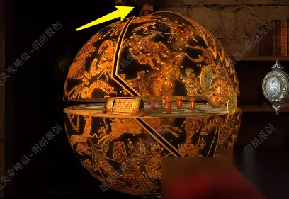 23.将奇怪的钥匙放入黄箭头处,按照地球仪上路线滑下至红箭头处,打开地球仪, 23.1