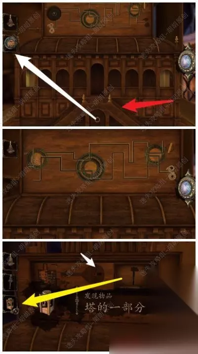 92.红箭头处放梯子模型,白箭头处拿到奖章,下图放上奖章调整线路将移动到最右边,接着点击权杖展开获得长轴透镜;白箭头处移动滑块,黄箭头处获得塔的一部分 92.1.2.3