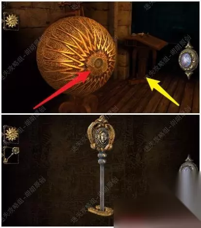 40.旋转画面至下图,红箭头处点击按钮,黄箭头处对准箭头;木块上方可以放入十二面体,下方旋转圆球将缺口对准四角;来到大木块右侧,黄箭头处拿到钥匙(十字头扳手) 40.1.2.3