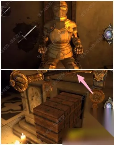 第五关 62.骑士手上拿到剑,粉箭头处放入剑转动,黄箭头处转动铁块,箱子打开,拿到弹簧装置和十字形物品 62.1.2