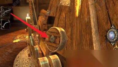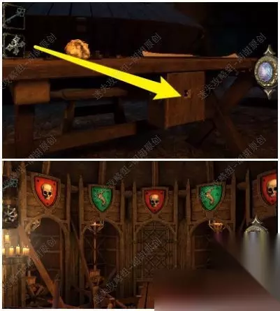 43.来到中心的木桌上,黄箭头处放入金属公羊头,红箭头处拿到雕刻的金属手柄;回到帘布的大木块处黄箭头放入金属手柄转动 43.1.2