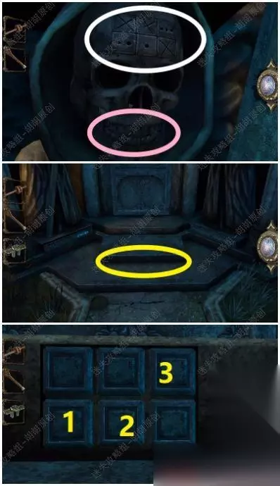 59.骷髅头上白框处有六方格子,嘴里拿到装饰把手;台阶下方黄框处的方格按照方格顺序点击石块,下方出现齿轮 59.1.2.3