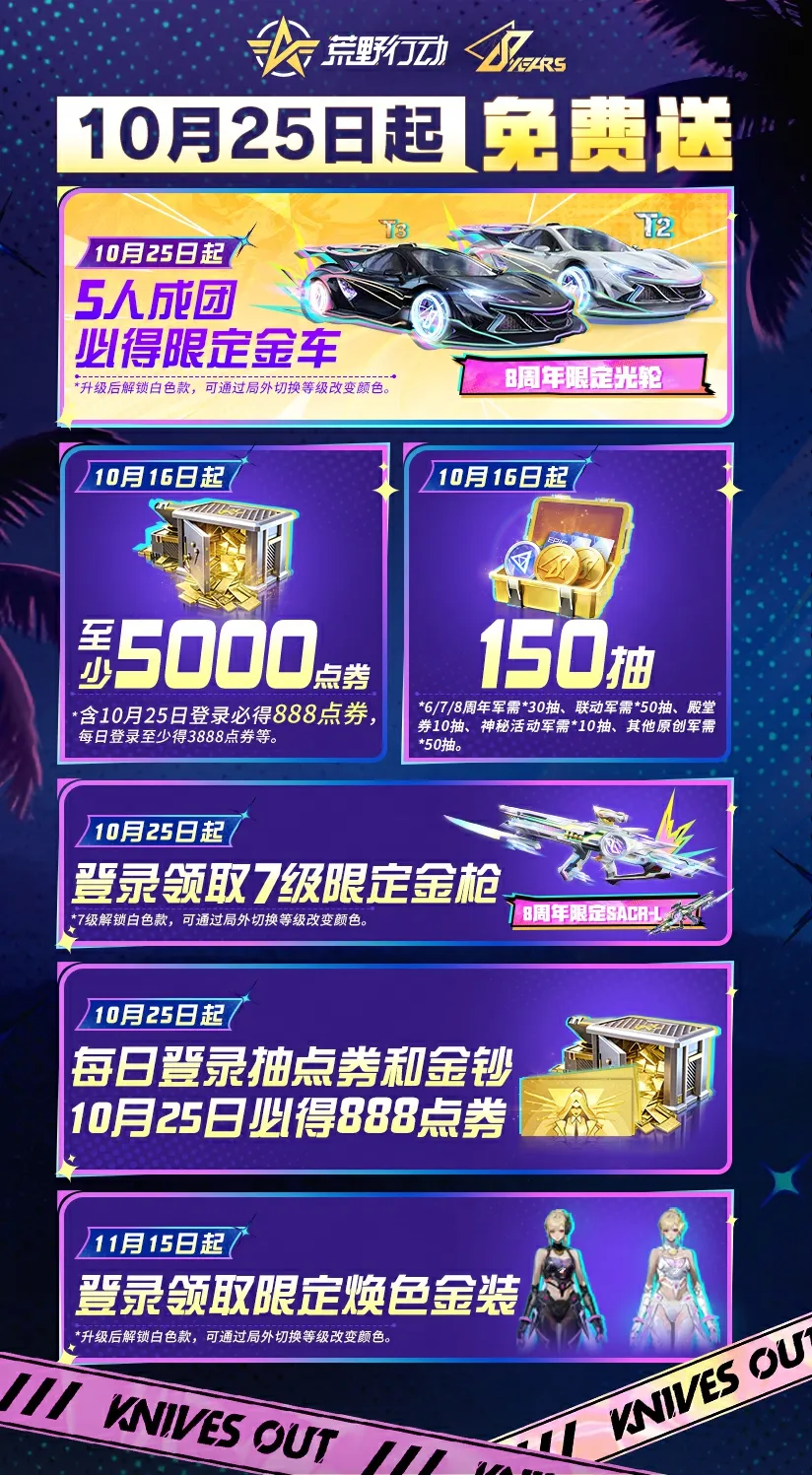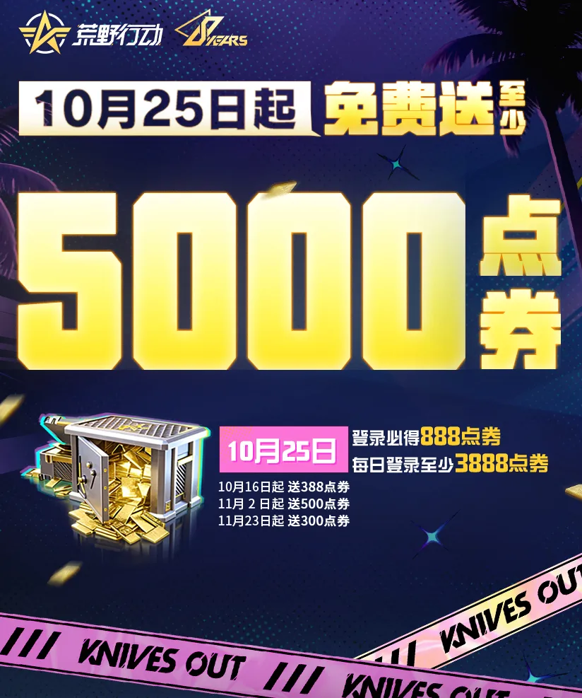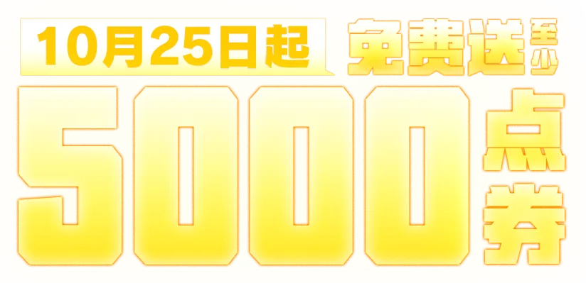 10月25日上线保底领888点券,活动期间每日登录就稳拿3888点券!整个周年庆参与活动,保底获得5000点券,量大管饱!