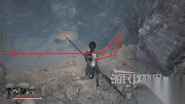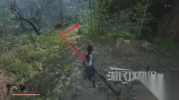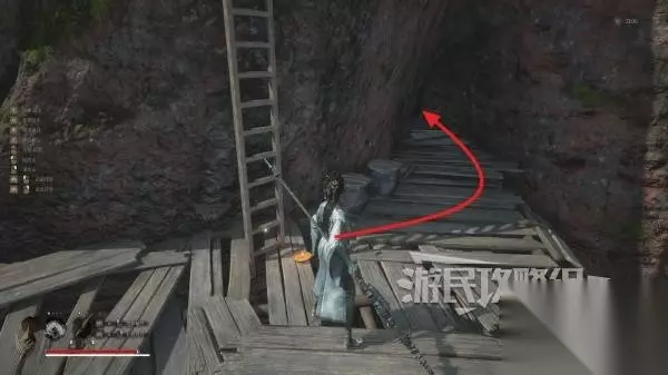 沿着山洞里唯一的路走到尽头,往下层看,可以看到一根斜搭的木头,下方还有怪,可以跳到木头上再往下层跳,下落过程中按轻攻击背刺下方的怪。然后继续往前方走。