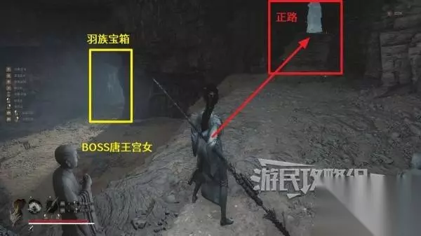 一直上楼梯走到BOSS唐王宫女所在区域,走上层的台阶离开山洞。注意洞口左侧有个阴人小怪。
