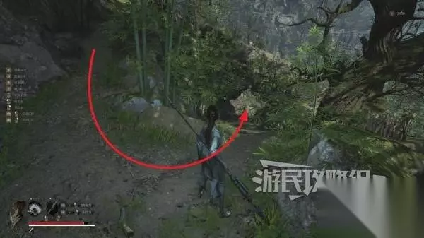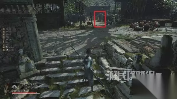 走到底部后往左看可以看到一个院门,进入院门。注意门里有小怪阴人。