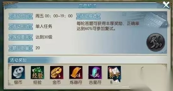文曲初试 每周五00:00-19:00 可通过点击主界面右上角活动-限时活动进入文曲初试 只需达到一定的正确率即可进入复试 PS:该题不计算答题时间,咳咳,你懂得。