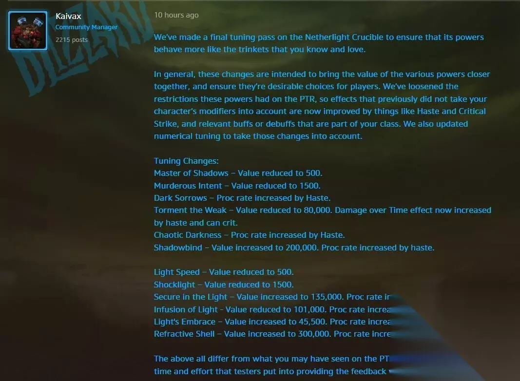 今天小编给大家带来的是关于魔兽世界虚空之光熔炉的调整介绍,设计师对虚空之光熔炉进行了最终调整,确保它的强度表现更接近你们熟知和喜欢的饰品。下面就跟随小编一起来看看魔兽世界虚空之光熔炉最终调整的详细内容介绍。