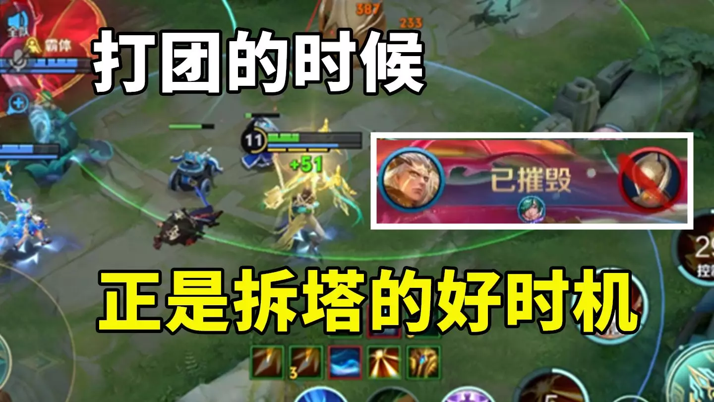 反正团战打不出伤害,不如趁着大家都在打团过来拆塔