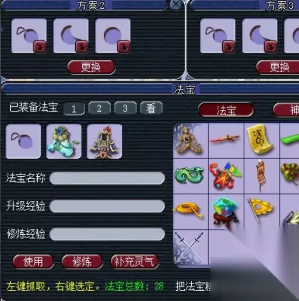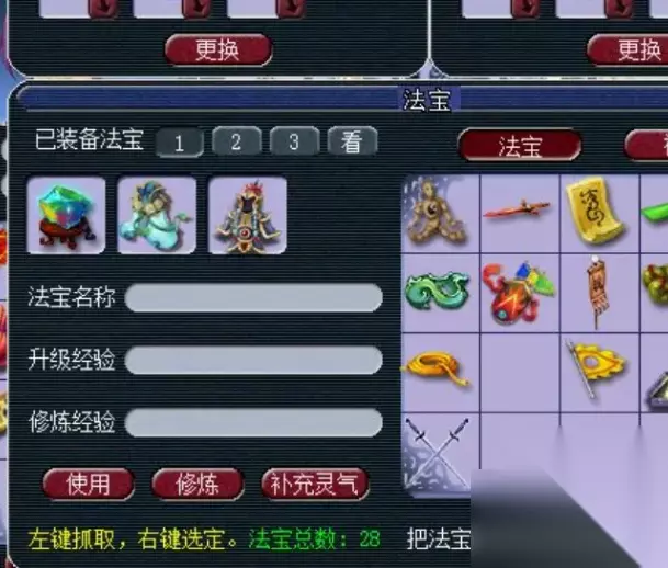 3、把你需要补充灵气的法宝装备好,最多装备三件,再次切换回道具栏,右键关闭法宝栏就可以了。