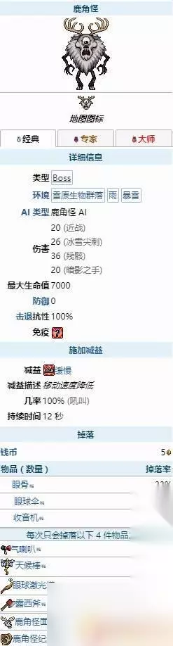 泰拉瑞亚是一款备受玩家喜爱的沙盒游戏,其中有许多令人兴奋的BOSS战,其中巨鹿是一个强大的BOSS,它拥有强大的攻击力和生命值。在击败巨鹿后,玩家将有机会获得丰富的掉落物品,包括但不限于巨鹿角、巨鹿皮和巨鹿之心等珍贵道具。这些掉落物品不仅可以用于合成强力装备,还可以用来提升玩家在游戏中的实力,让玩家更加轻松地挑战其他强大的敌人和BOSS。巨鹿的掉落物品丰富多样,为玩家提供了更多的选择和挑战,让游戏变得更加有趣和刺激。 泰拉瑞亚巨鹿有什么掉落泰拉瑞亚巨鹿掉落物品 独眼巨鹿的掉落物有:鹿角怪圣物(大师)、眼骨(宠物,非大师。可以召唤一个随身携带的猪猪存钱罐)、收音机零件(时装)、眼球伞(时装)、骸骨头盔(专家)、天候棒(法师武器)、鹿角怪眼球(大师,宠物)、眼球激光塔(召唤哨兵)、露西斧,气喇叭、鹿角怪面具。