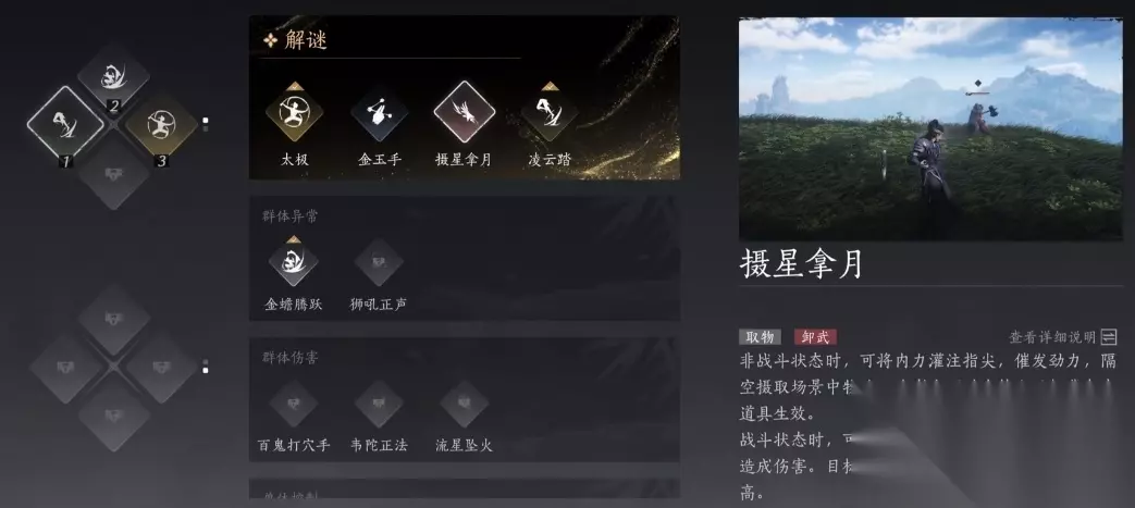 摄星拿月效果 非战斗状态时,可将内力灌注指尖,催发劲力,隔空摄取场景中物体,此式亦可对宝箱和目标背包中道具生效。 战斗状态时,可用于夺取敌方武器,牵引回击并且造成伤害。目标武器愈沉重,则牵引回击的伤害越高。