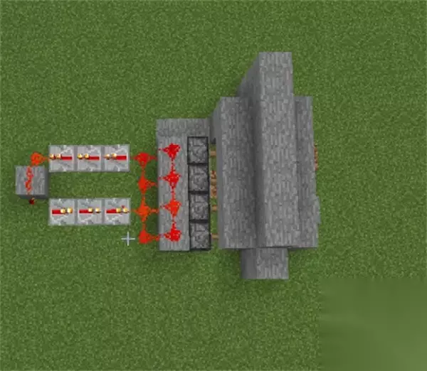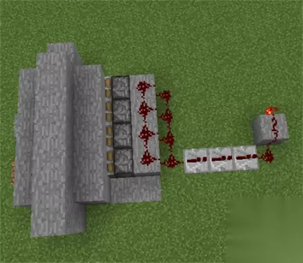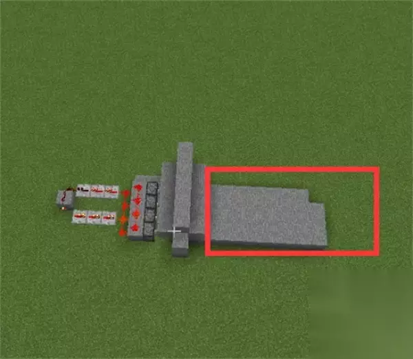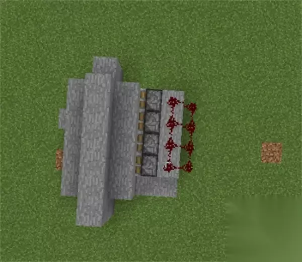 4、活塞另一侧放一排石头,放上红石,下方地面上也放红石。