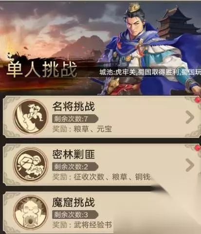 密林剿匪每一天都会刷新不一样的任务,其中部分的关卡还会有阵营限制,例如禁止吴国武将出战。记得要提前搭配好符合要求的队伍,随着等级的提升,就会解锁更高级的关卡,奖励也会直接翻倍。在这里就可以获得粮草,还有铜钱,全部都是日常资源补给的重要来源。魔窟挑战的奖励还是比较丰富的,可以获得武将经验书,还有铜钱,每天可以挑战三次,前期不需要去追求高难度,根据自身的武将战斗力去选择合适的关卡,可以确保稳定通关,能拿满奖励。