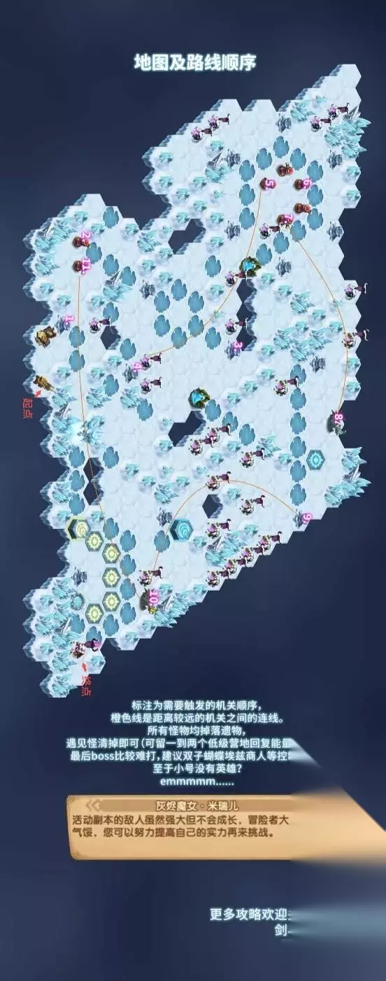 ④地图解析: 标注为需要触发的机关顺序; 橙色线是距离较远的机关之间的连线; 所有怪物均掉落遗物; 遇见怪清掉即可(可留一到两个低级营地回复能量生命用); 最后boss比较难打,建议双子蝴蝶埃兹商人等控制过去。