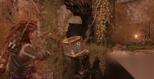 然后用箱子上去,之后可以看到一个障碍物,我们使用武器将其炸开