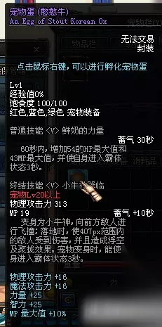 憨憨牛这个宠物的属性比较一般,物攻/魔攻增加16点、力量智力增加25点、MP最大值10%。然后宠物的总结技能仅仅就是向前跳一下,然后将小范围内的敌人聚集到一起并且浮空霸体怪物还无效。