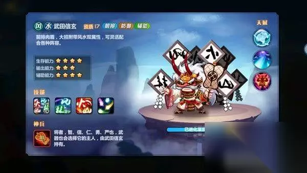 武田信玄:辅助型神将,开场增加我方全体速度以攻击力,大招“风林火山”连续施展四个状态(风-击飞面前范围敌人施加旋风状态,林-施加潮湿状态,火-为我方全体施加狂暴状态,山-为我方全体施加护盾)。